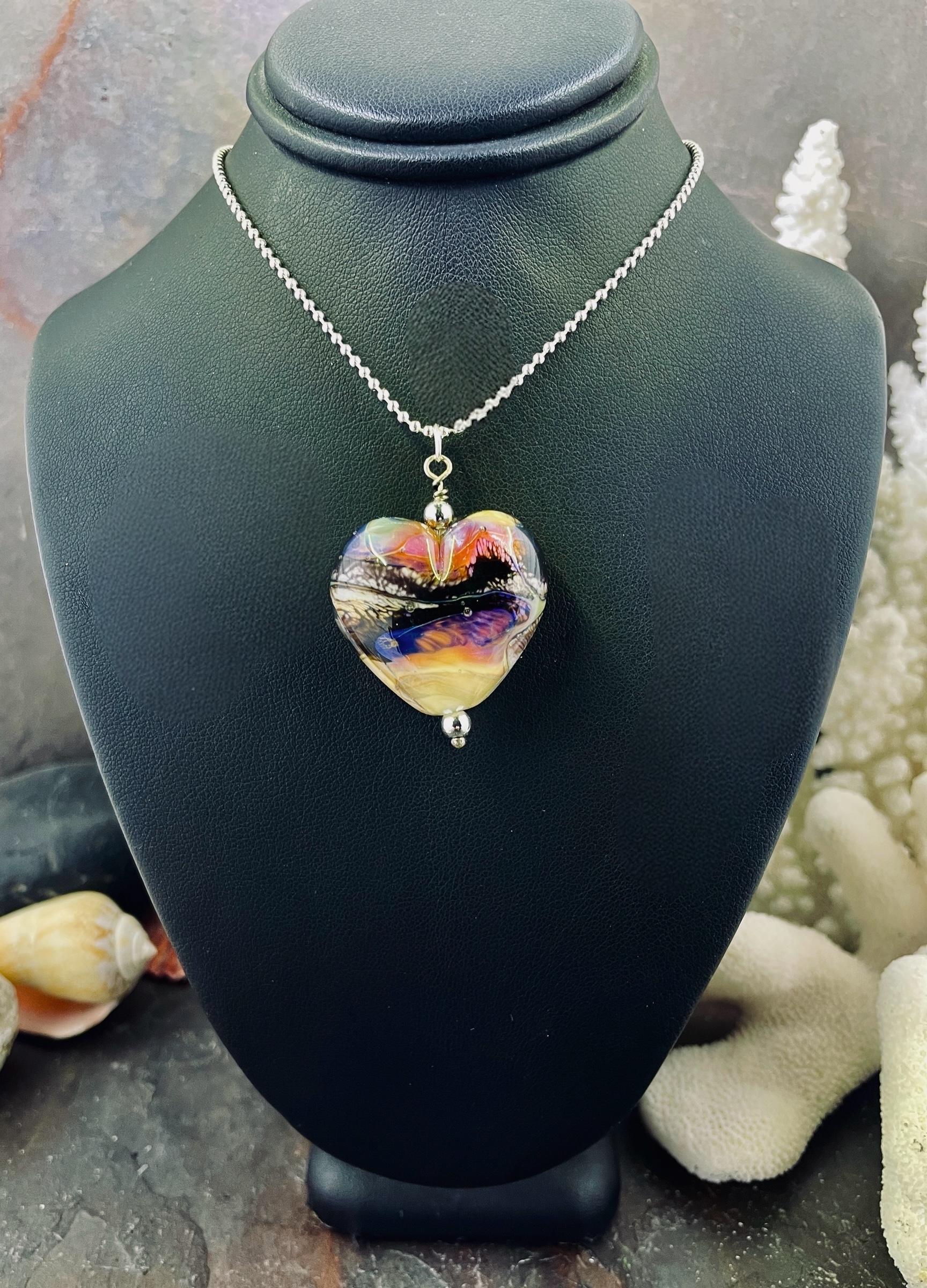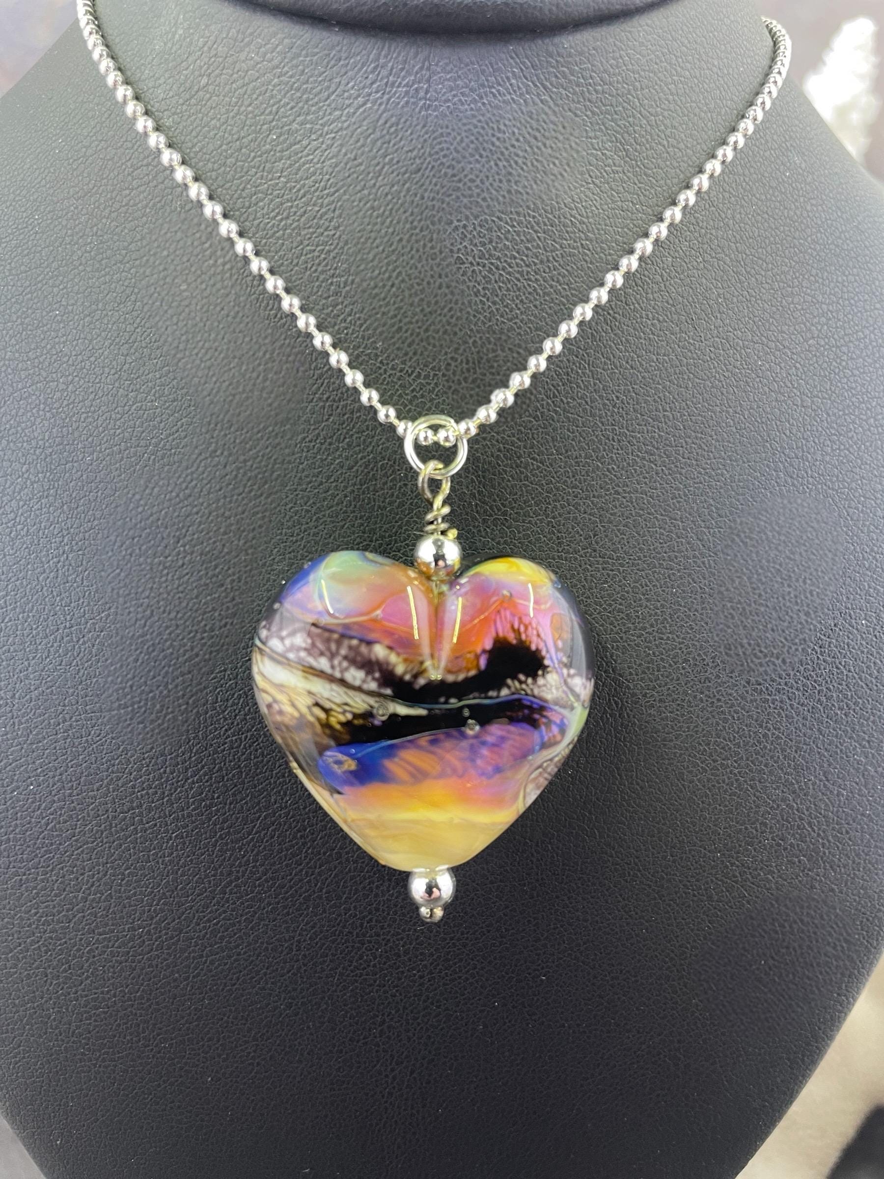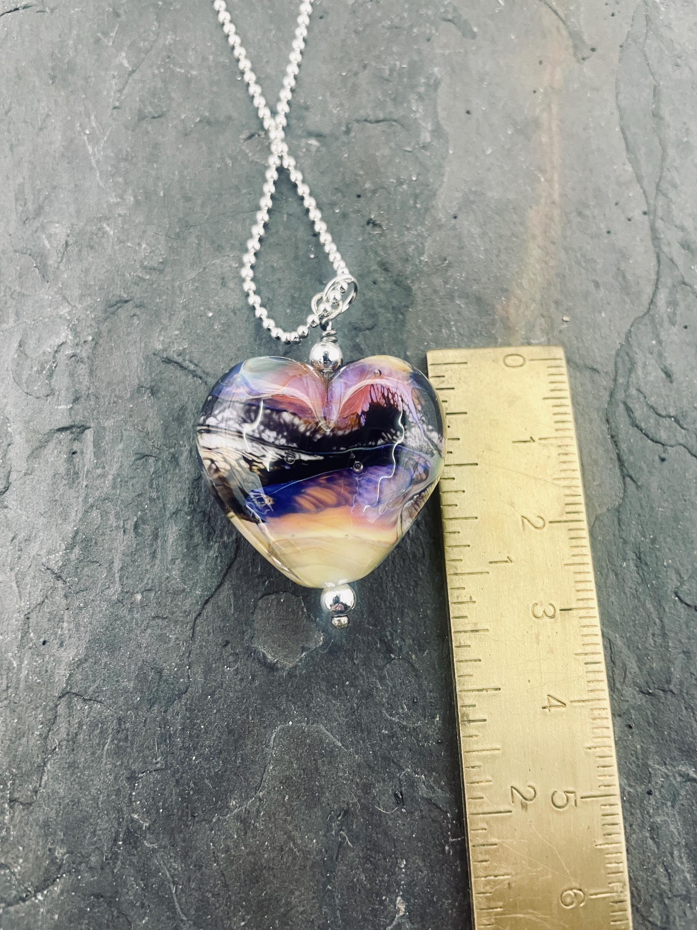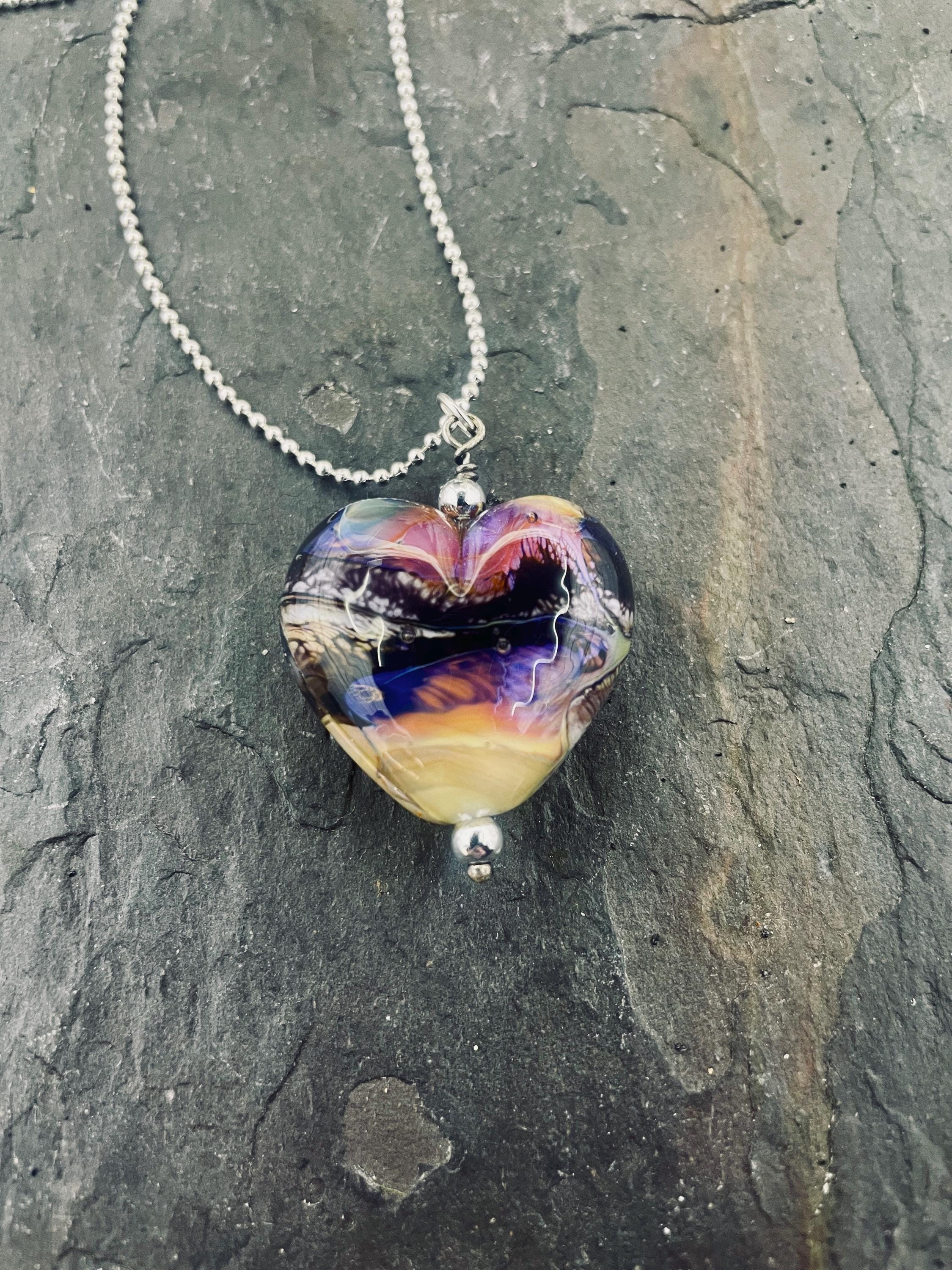 Here’s a fun silver glass heart with all the strange colors of the glass called Echo. Not your average Valentine heart! Handmade in the torch of Italian glass, then digitally annealed for durability, it arrives in a cute little gift box, ready for giving....or for keeping, we won't tell! Approx 1.25" long, hangs on a delicate 1.5mm 19" long silver filled ball chain.