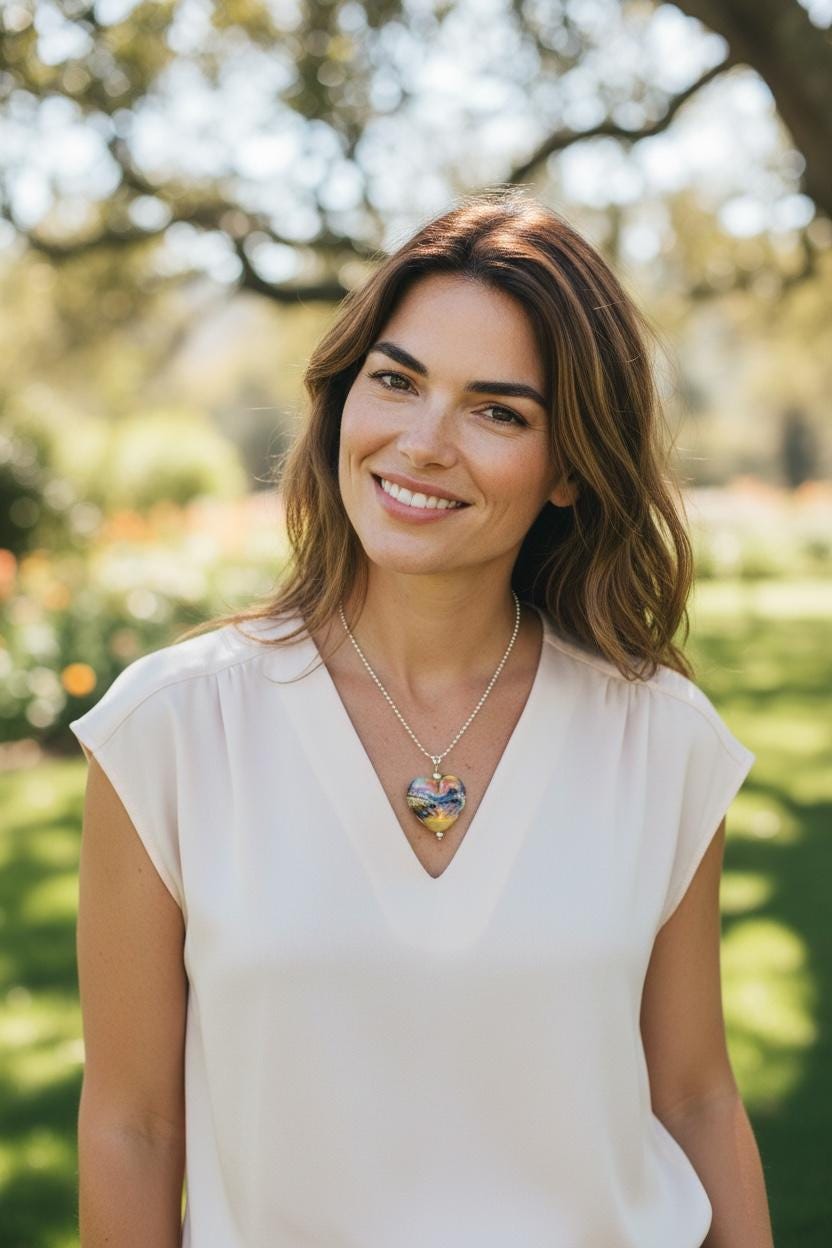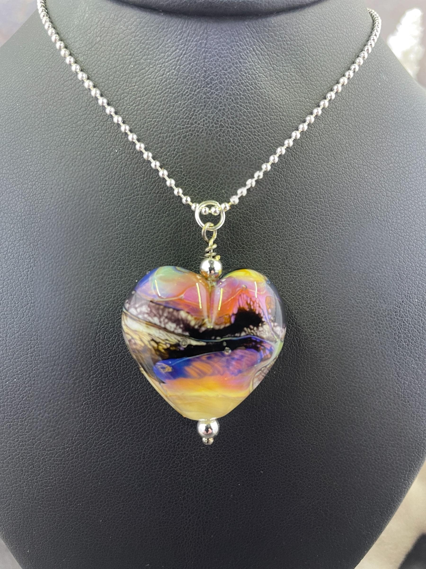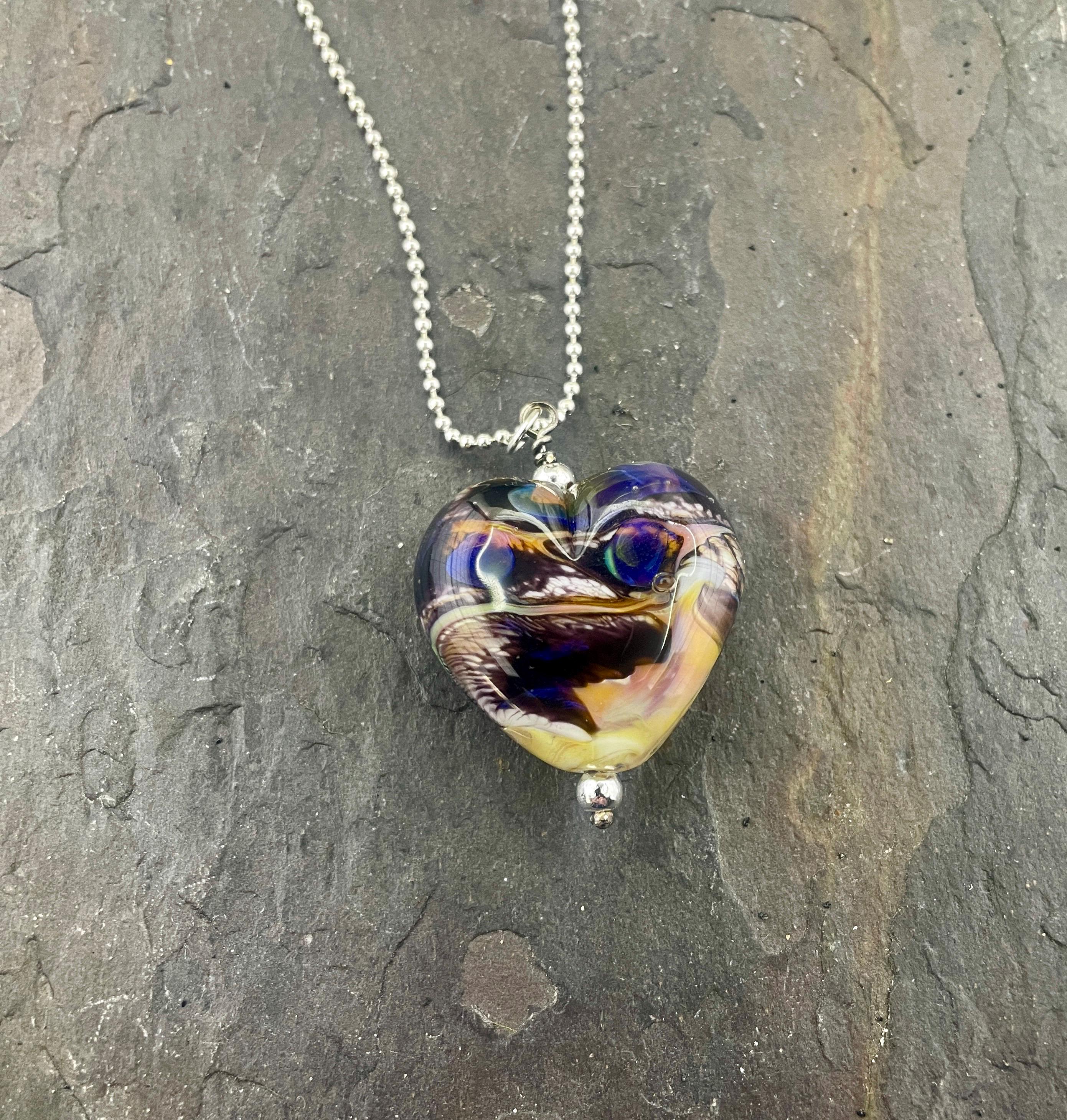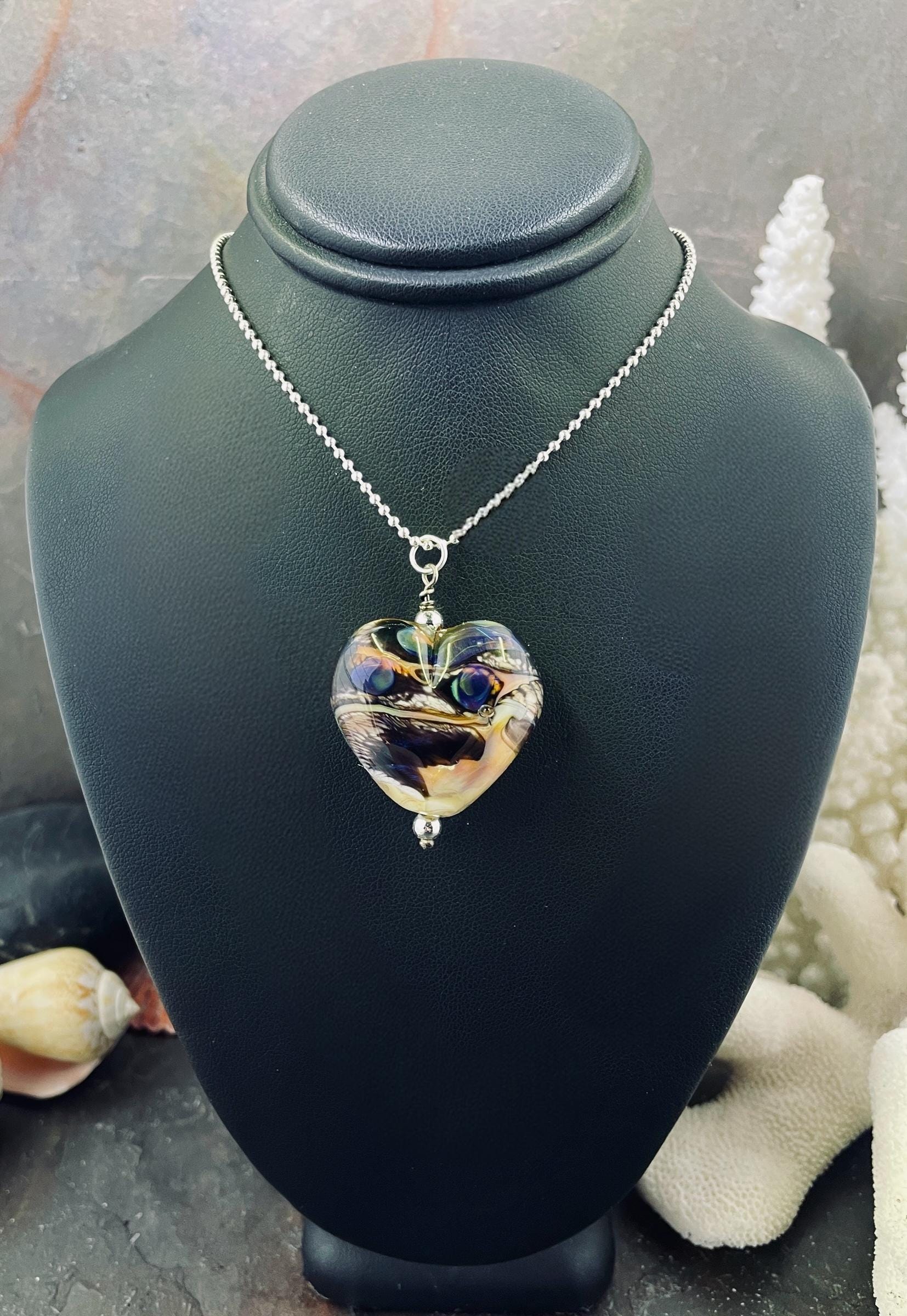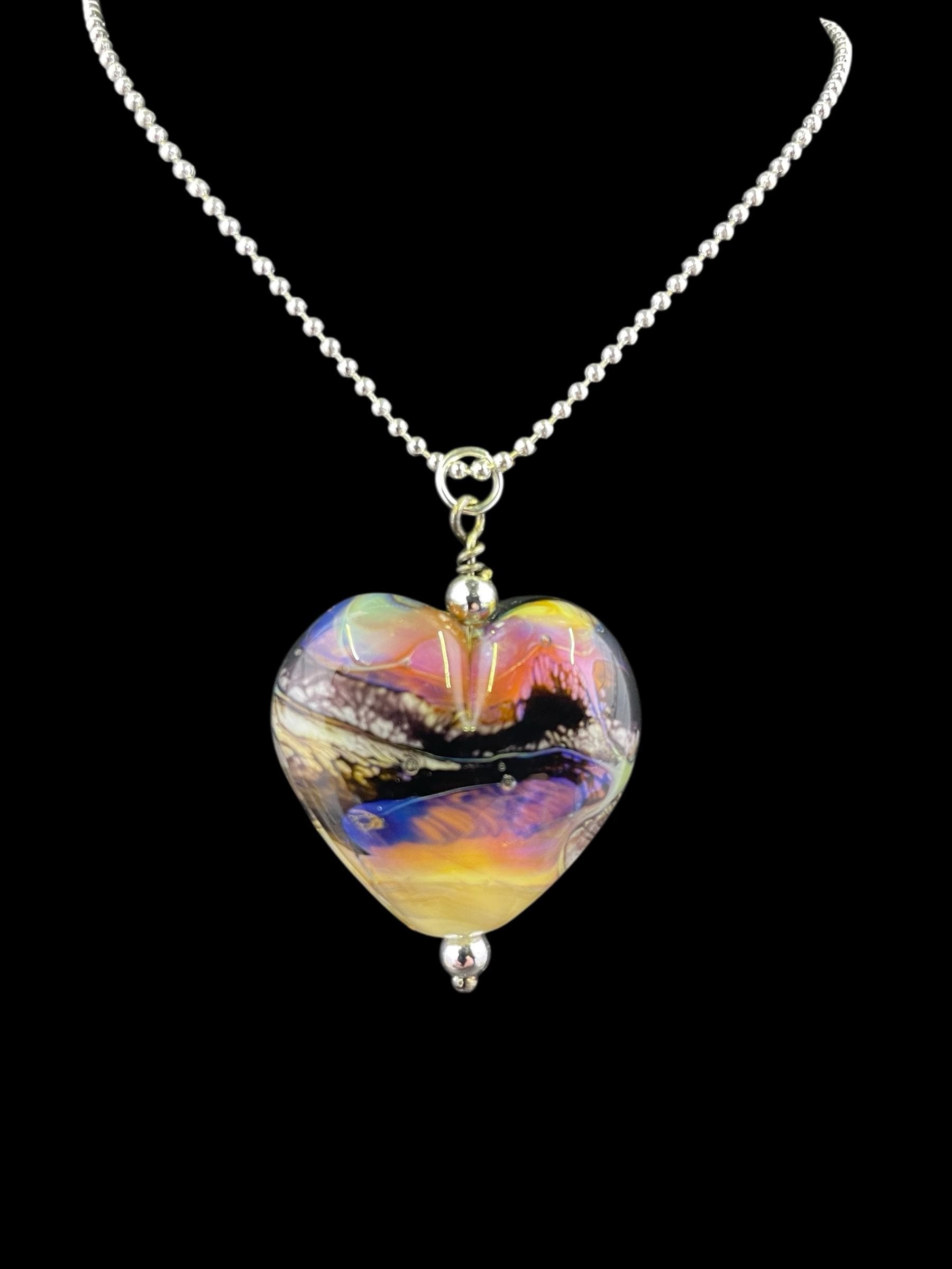 Here’s a fun silver glass heart with all the strange colors of the glass called Echo. Not your average Valentine heart! Handmade in the torch of Italian glass, then digitally annealed for durability, it arrives in a cute little gift box, ready for giving....or for keeping, we won't tell! Approx 1.25" long, hangs on a delicate 1.5mm 19" long silver filled ball chain.