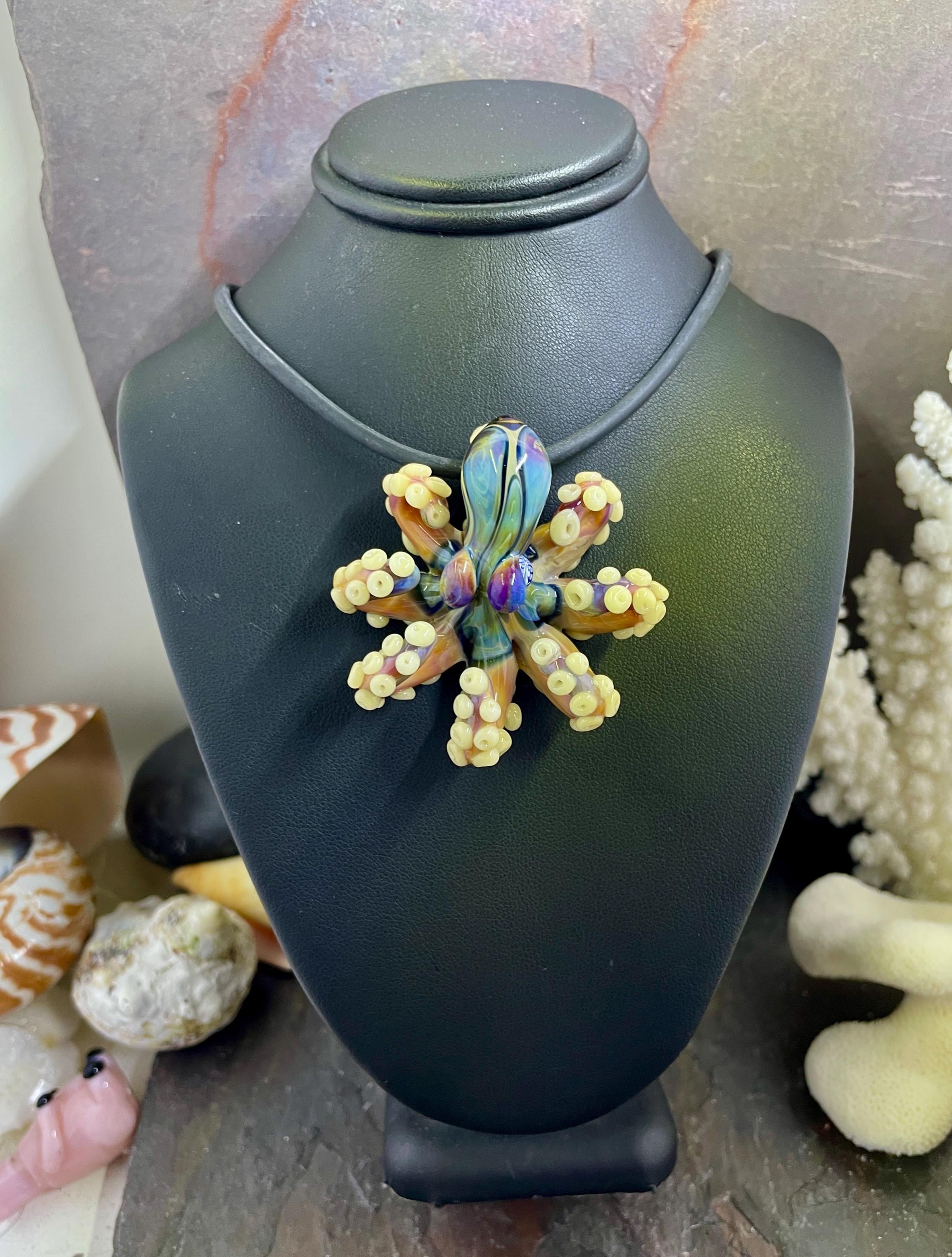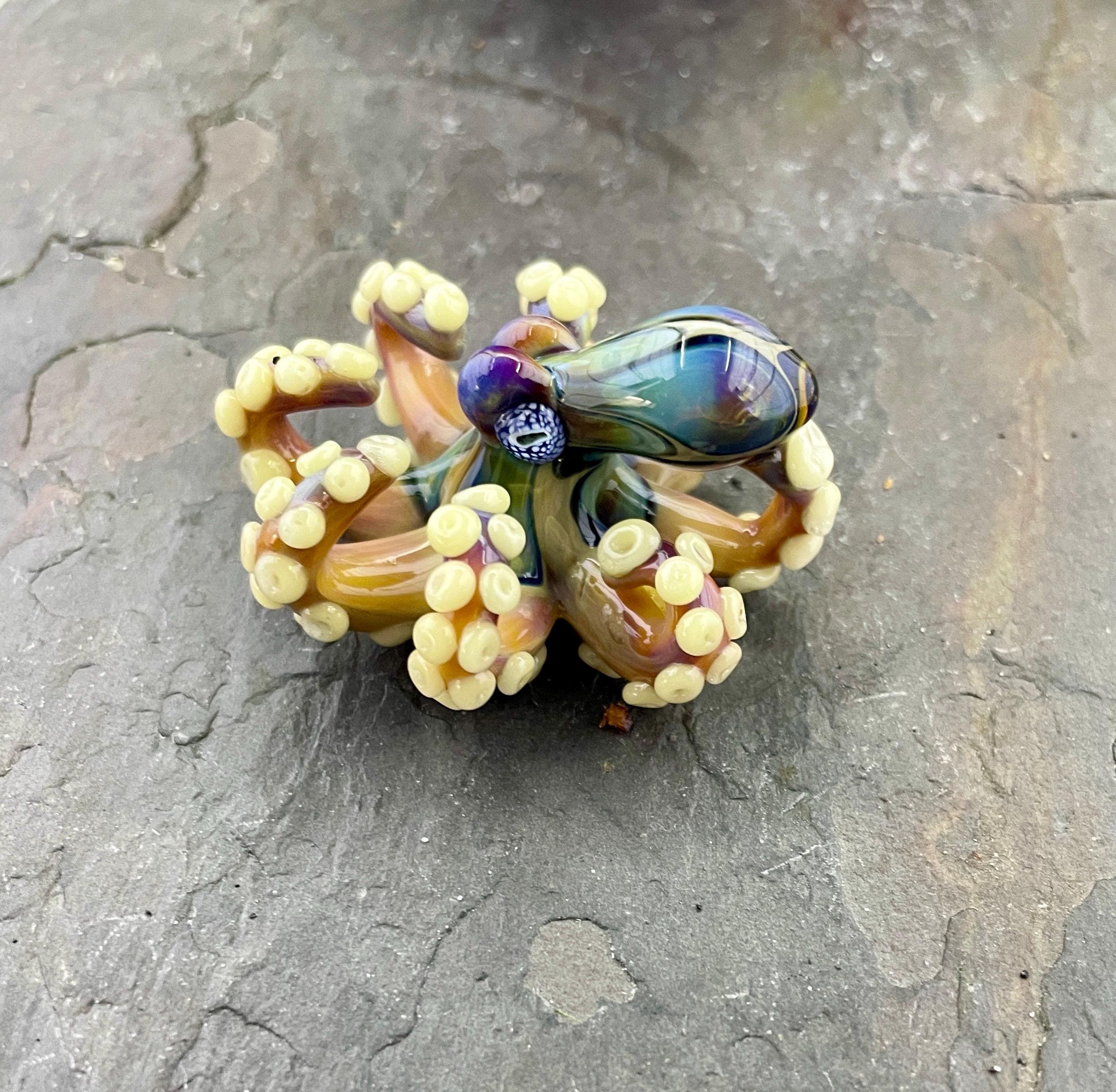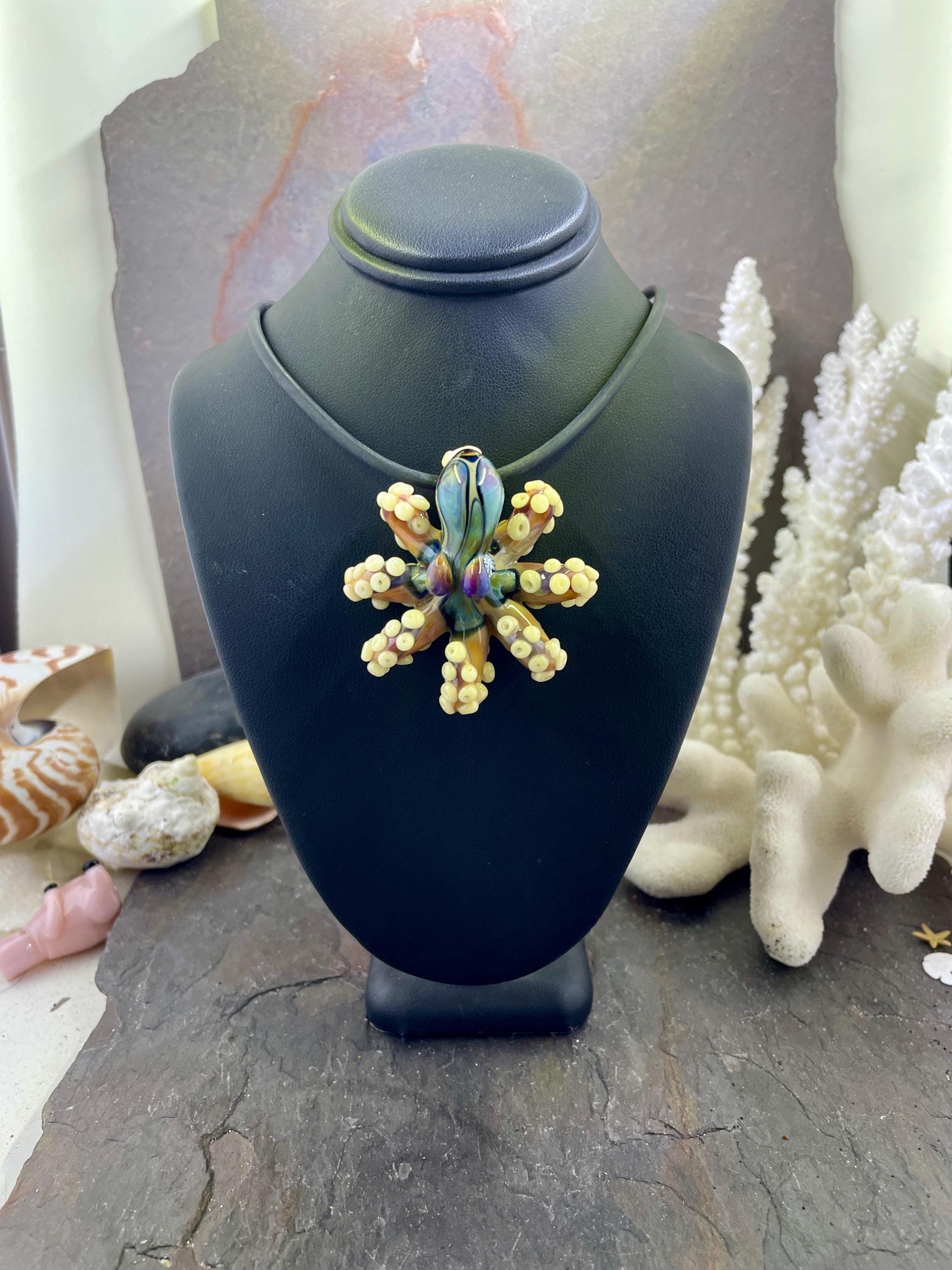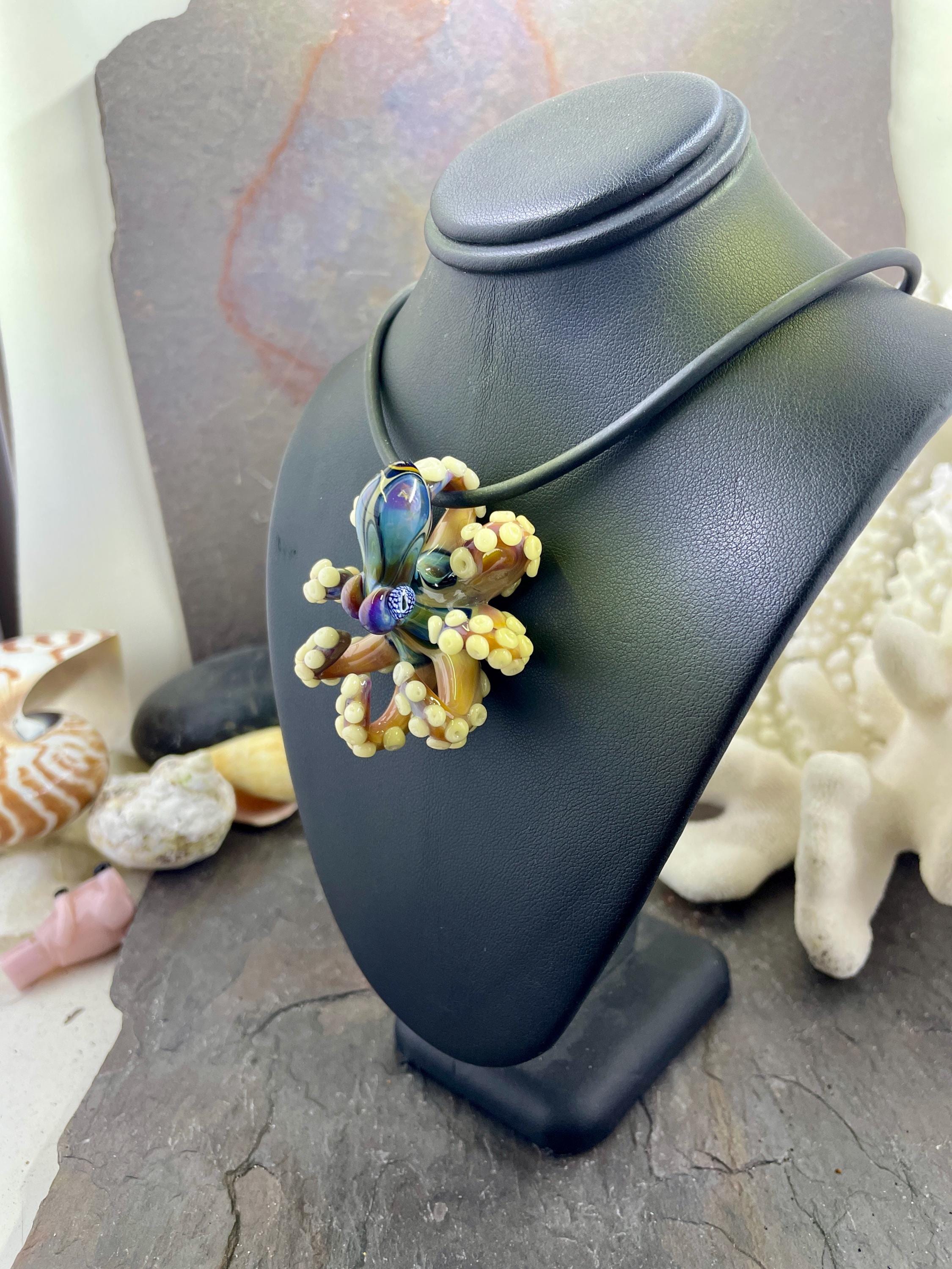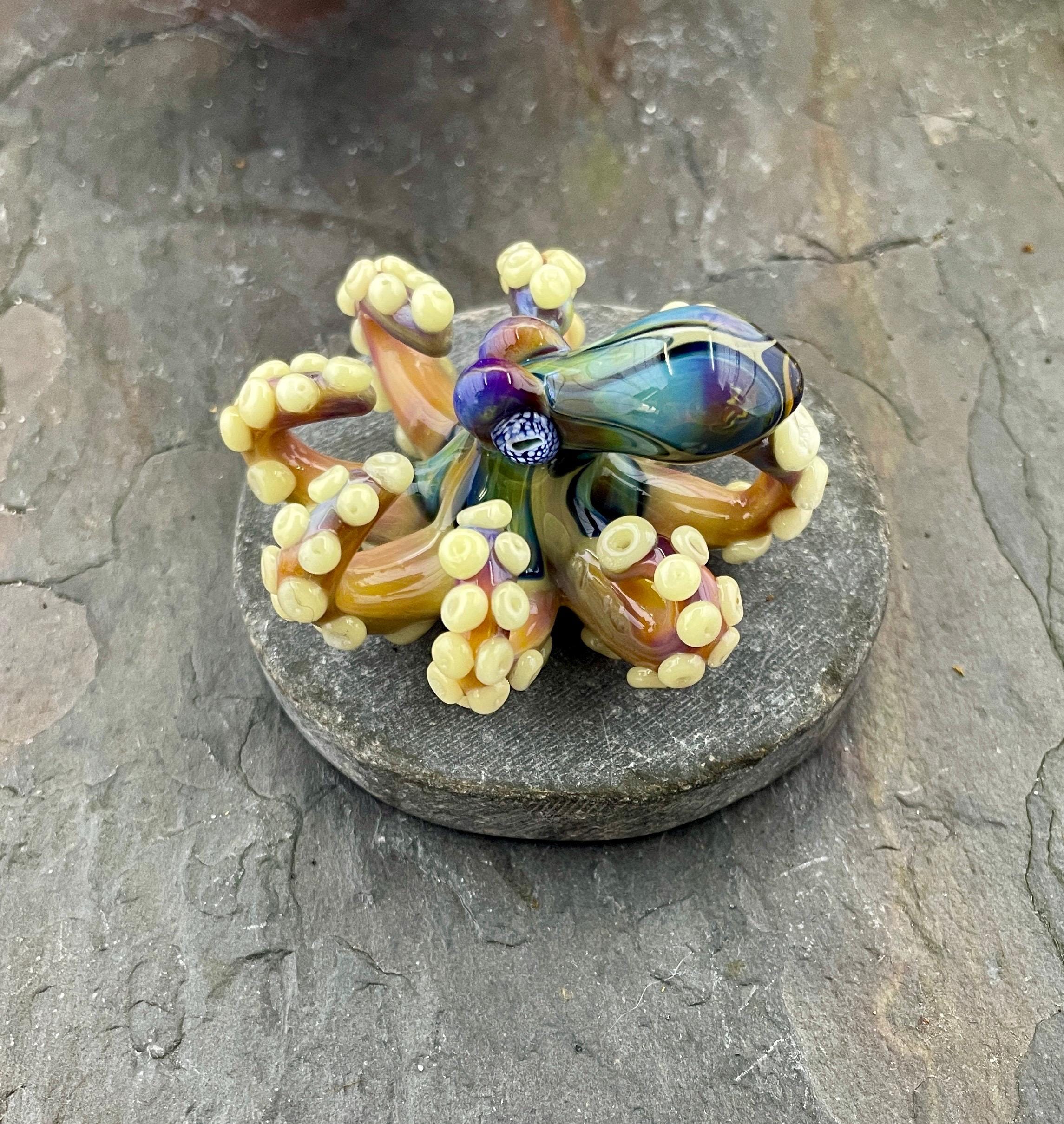 Another of my new favorites.... a mini octo friend made with the beautiful Stormy Weather borosilicate glass. This one is right around 2" across. This is a new style, with many, many little butter colored suckers on her little arms. She arrives on an adjustable black silk cordnecklace in a protective metal gift box….. even if it’s a gift to yourself! Formed in the torch using no molds and properly annealed in a digital kiln for durability. Handmade glass eye chip gives her such realistic eyes, you might want to keep him on his chain, just in case! Really fun and safe to wear, for a truly dramatic look! Marked on the bottom with the Maker's Mark "M" while still molten..