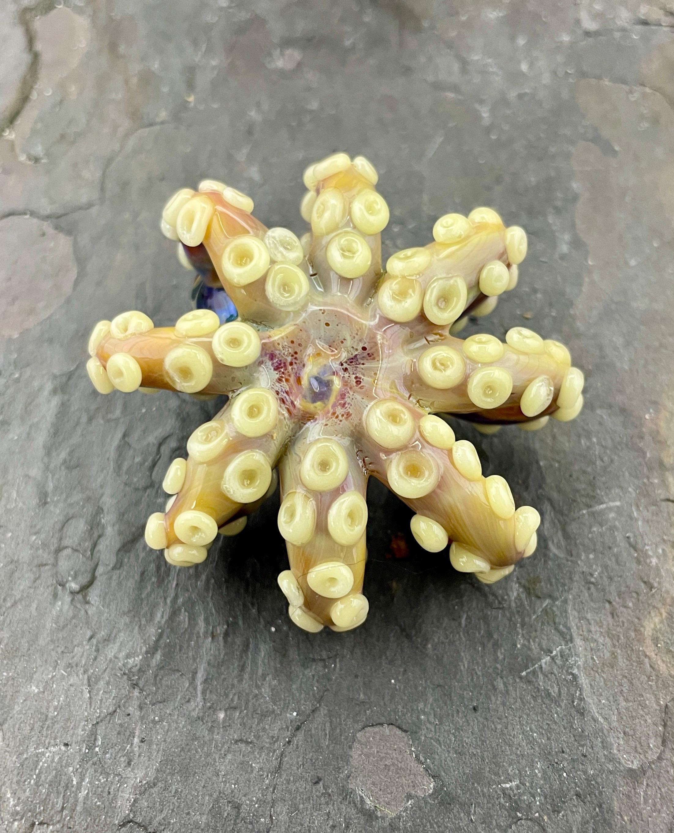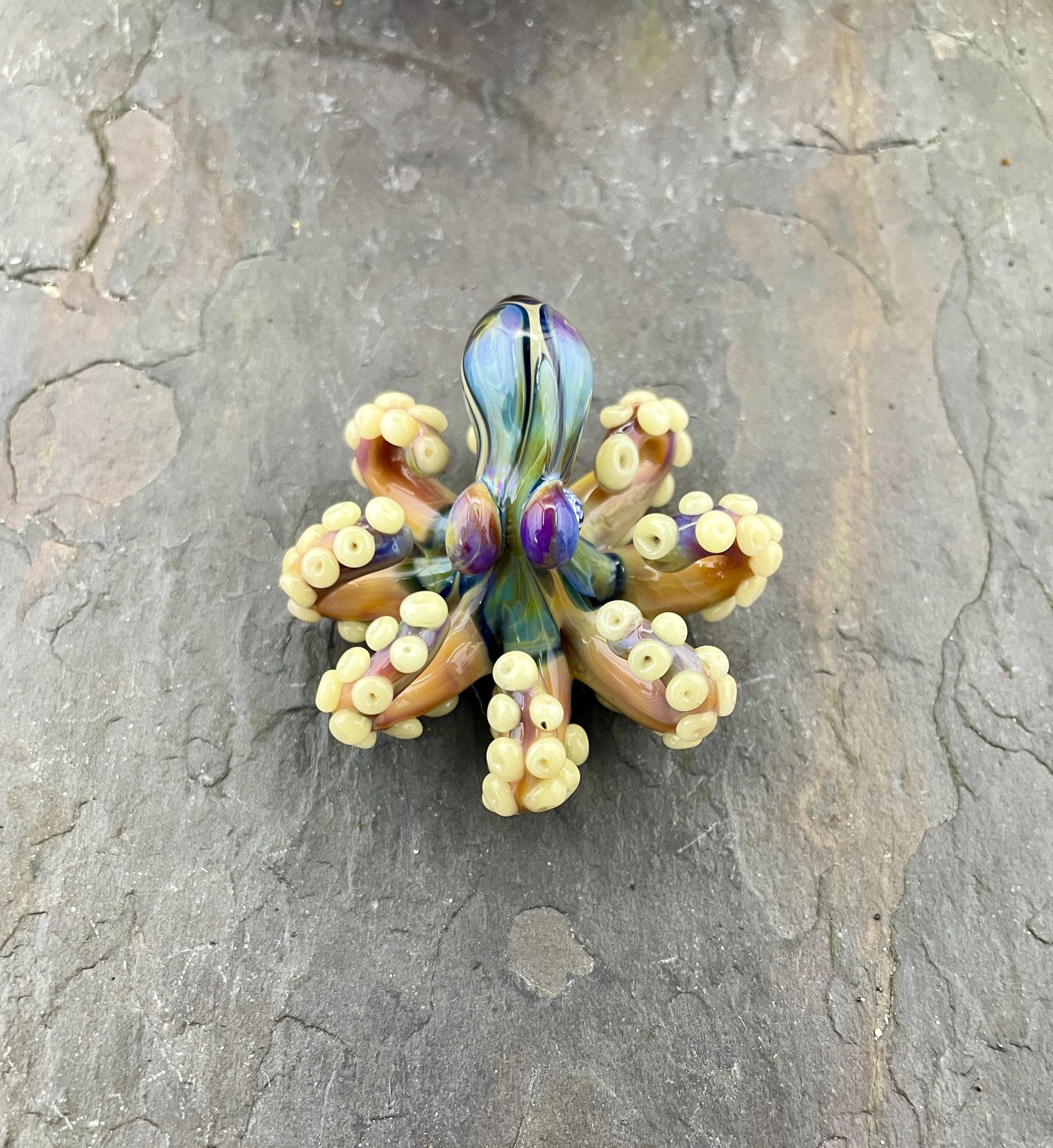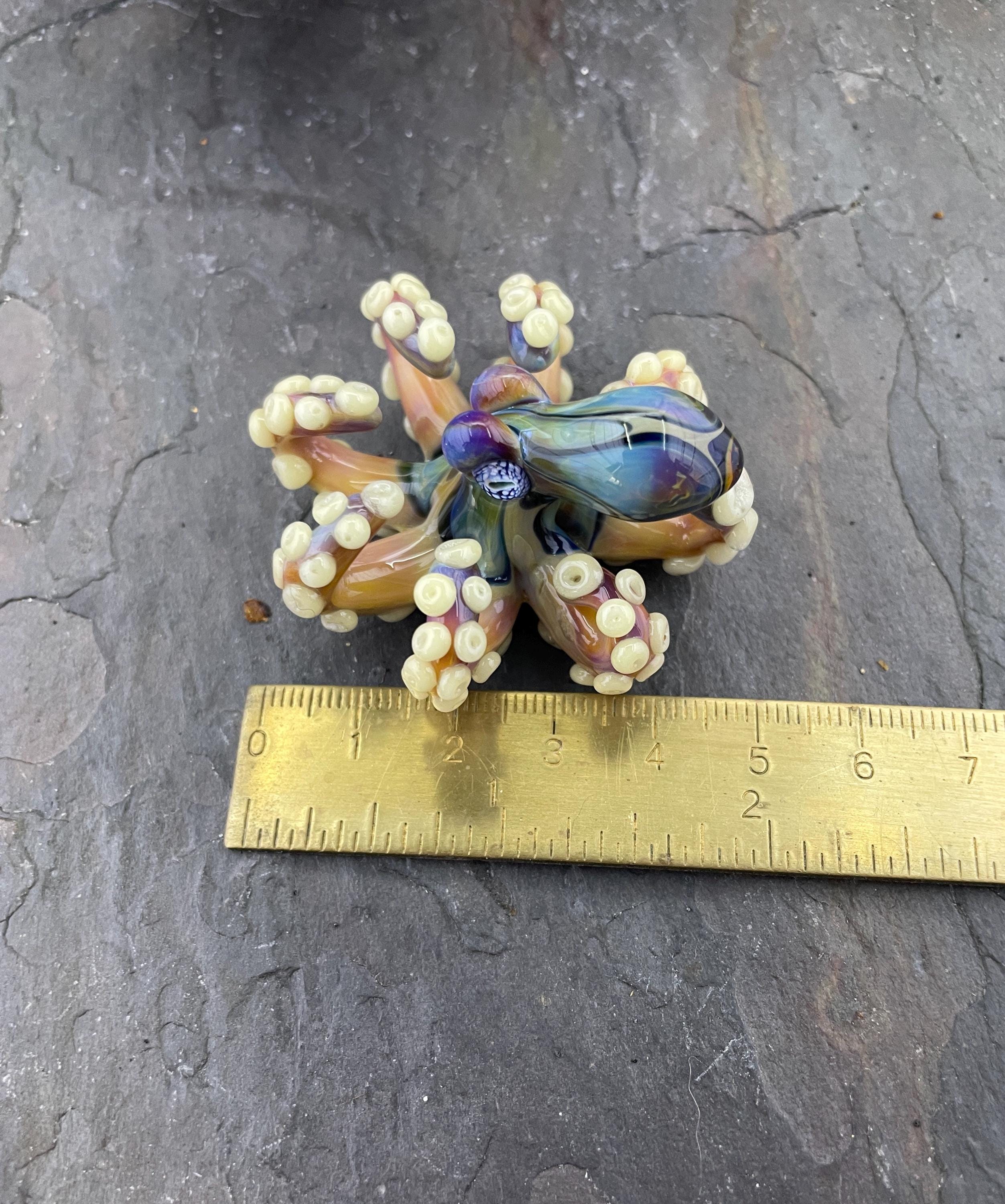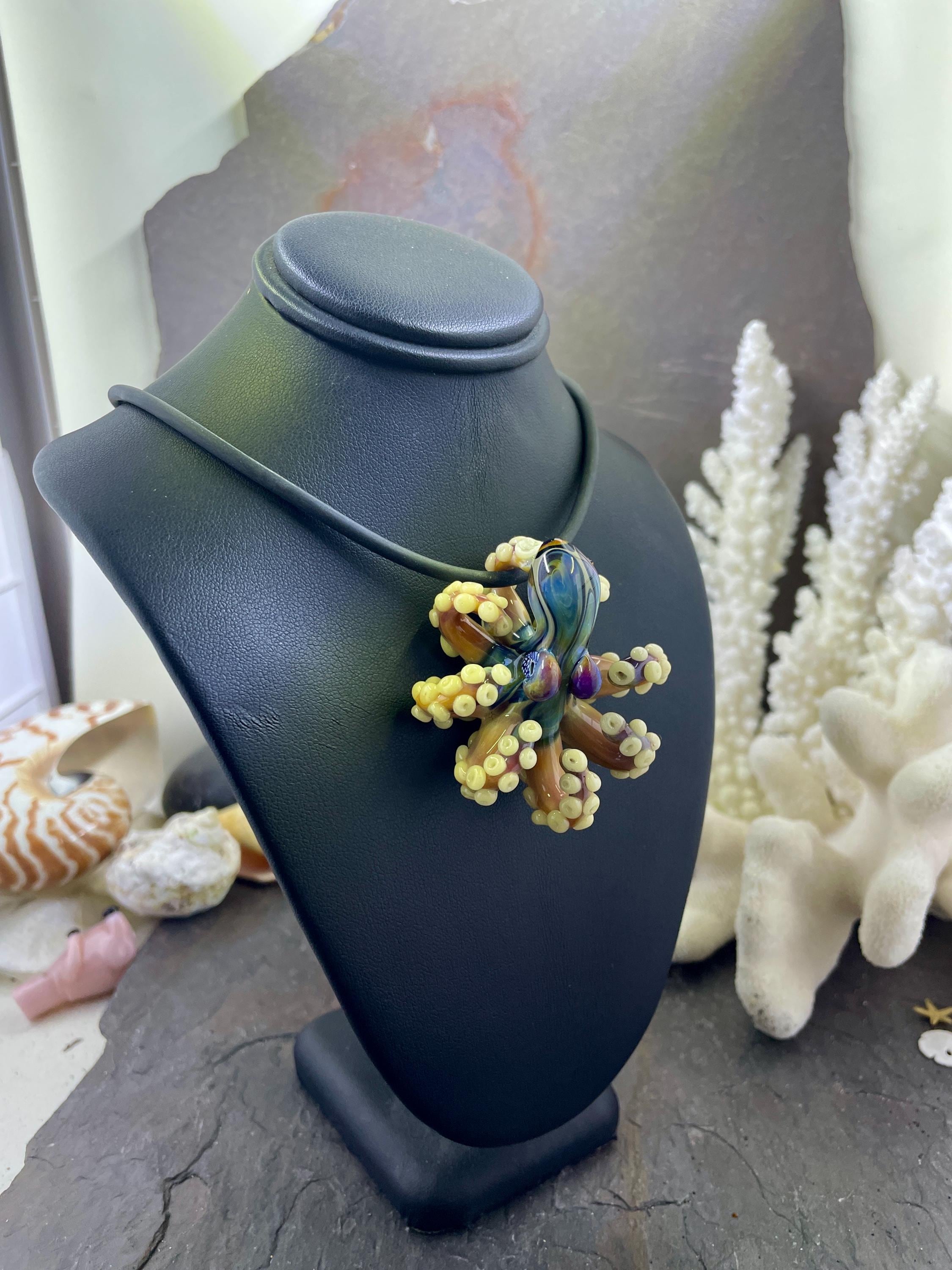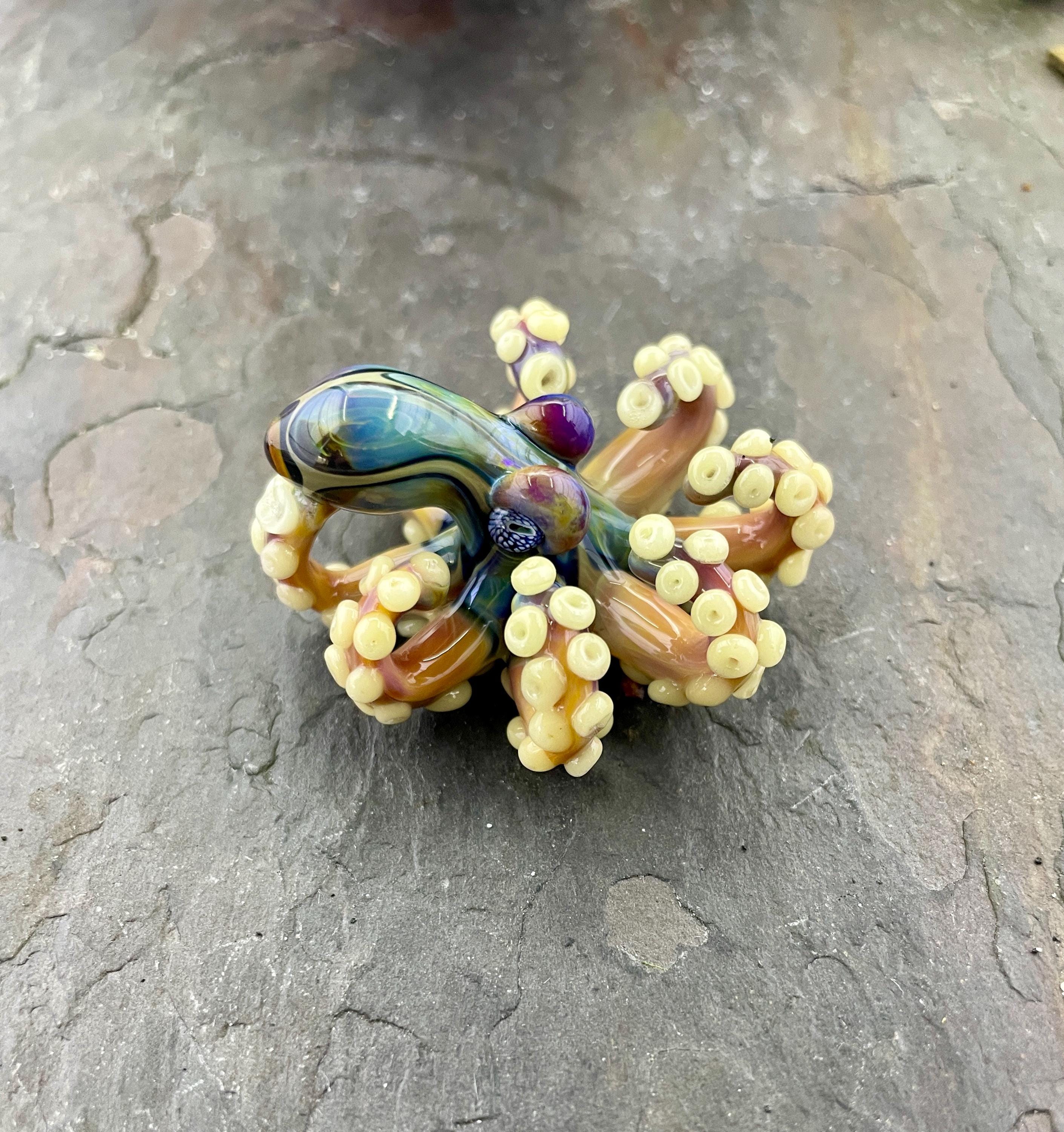 Another of my new favorites.... a mini octo friend made with the beautiful Stormy Weather borosilicate glass. This one is right around 2" across. This is a new style, with many, many little butter colored suckers on her little arms. She arrives on an adjustable black silk cordnecklace in a protective metal gift box….. even if it’s a gift to yourself! Formed in the torch using no molds and properly annealed in a digital kiln for durability. Handmade glass eye chip gives her such realistic eyes, you might want to keep him on his chain, just in case! Really fun and safe to wear, for a truly dramatic look! Marked on the bottom with the Maker's Mark "M" while still molten..