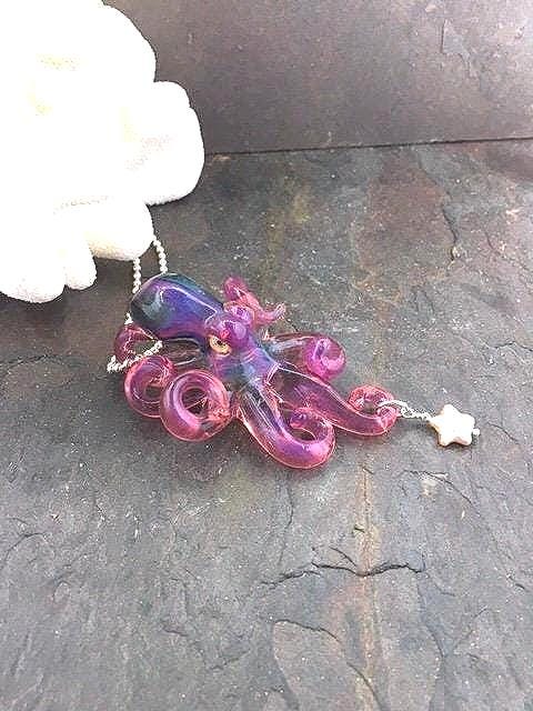This is the Telemagenta Pearl ! An amazing new AuraTone glass that just glows from the inside. Hyacinth freckles and green hood markings made him perfect for summer wear! He comes attached to a silver filled ball chain, to match the silver in you choice of the Heart shaped coin pearl or the Star shaped pearl. Both are genuine freshwater pearls in wonderful shapes. Or you can choose the adjustable black silk cord necklace. Handmade new style glass eye chip gives him such realistic eyes, you might want to keep him on his necklace, just in case! Really fun and safe to wear, for a truly dramatic look! Marked on the bottom with the Maker's Mark "M" while still molten.